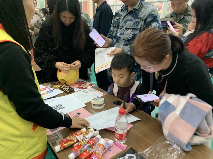 “‘军民亲如一家人’,打一字,猜猜是什么呢?”“军民亲如一家,军民鱼水情,有鱼有水,‘渔’字?”“祖孙花样灯谜”摊位,大家两两合作,大开脑洞,积极互动中,现场十分热闹。