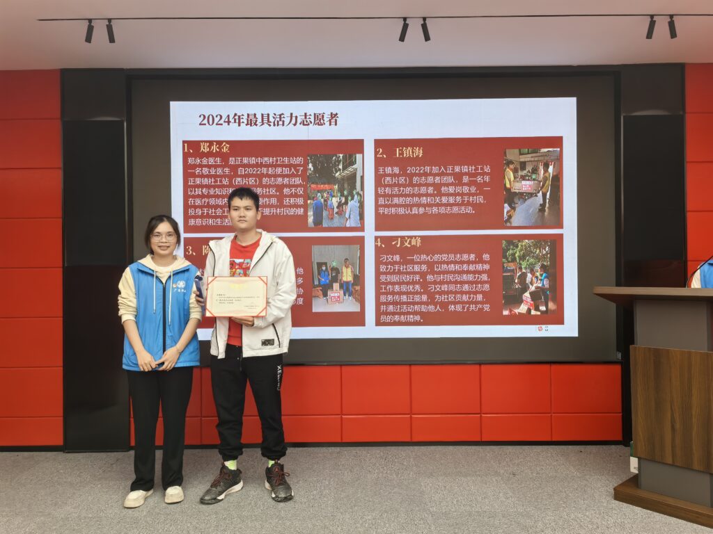 表彰环节是大会的重要环节,主持人逐一揭晓了各个奖项的获得者,并由李主任为他们颁发了荣誉证书和奖品。优秀志愿者、最具活力志愿者、最美志愿者、优秀志愿者骨干以及最积极志愿者等奖项的获得者依次上台领奖,李主任为他们颁奖并合影留念。特别值得一提的是,潘素梅女士作为“最积极志愿者”上台领奖。她在社工站的服务中扮演了非常重要的角色,定期陪同社工进行入户探访,了解社区内居民的生活状况和需求,倾听服务对象的心声,协助社工提供必要的情感支持。志愿者表彰大会还颁发了优秀志愿者团队奖项给“志愿行,共成长”爱同行志愿服务队,他们的表现同样值得称赞。